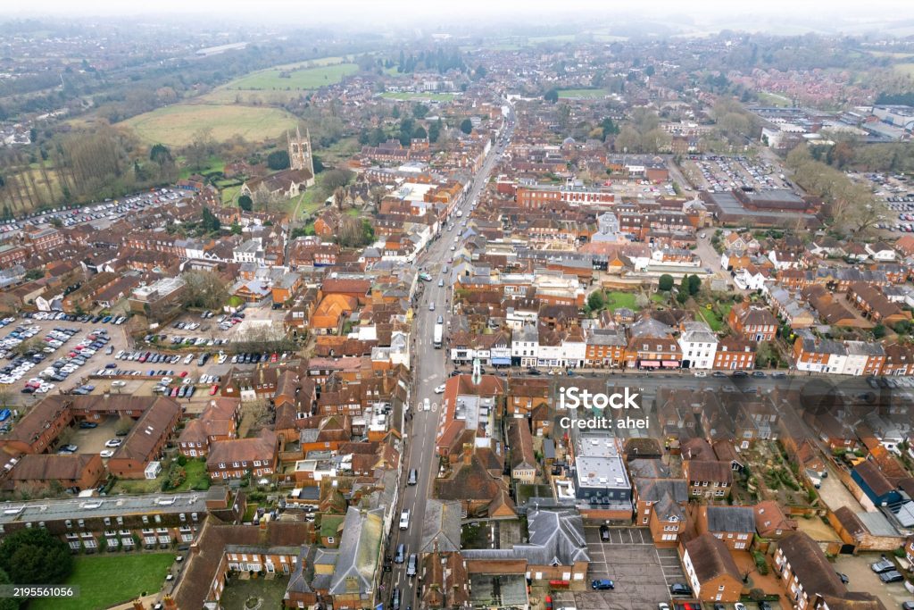 Waverley Planning Matters Aerial view of the downtown center high street of Farnham, Surrey England, in a Misty winter day, UK